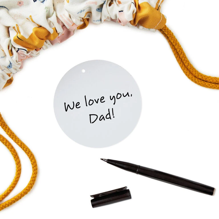 - Fabric gift bag features a colorful pastel animal print on white canvas and a gift tag.