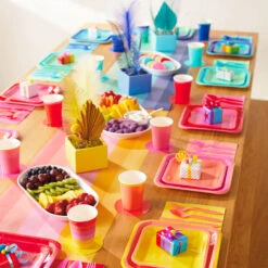 - 60-piece Color Pop Premium Party Kit includes 12 each: star-shaped red plates with gold foil border, red paper straws with gold foil diagonal stripe, red and white place cards with gold foil scattered dots. Kit also includes 24 red printed napkins with gold foil scattered dots and “The more the merrier” message.