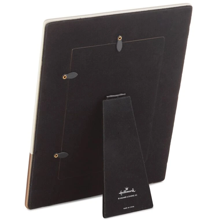 - Ceramic frame features metallic accents, embossed lettering and a linen texture.