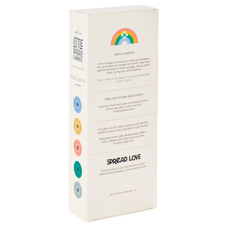 - Box includes one cotton and poly-fiber doll and a kindness kit with five wooden tokens with special phrases to show teamwork, courage, being you, caring and kindness.