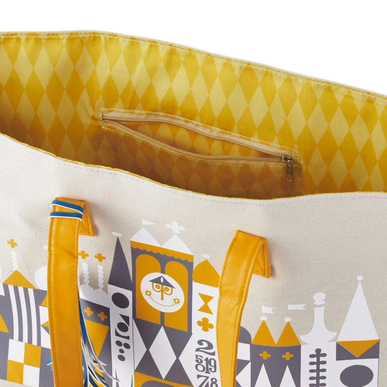 - Walt Disney World cotton canvas tote bag with faux leather handles features an illustration of the “it’s a small world” park attraction and a tassel attachment with polyester, diamond-pattern interior lining.
